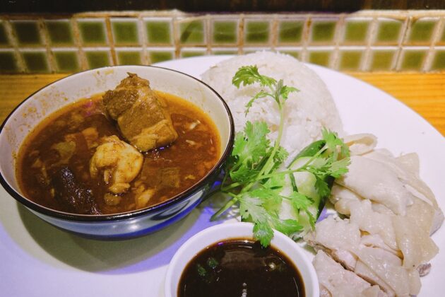 ふっくらと炊かれたチキンライスに、やわらかい蒸し鶏がのっていて、ひと口目からしっかり満足感がある。鶏のうまみがごはんにしみていて、シンプルなのに飽きない味だった。