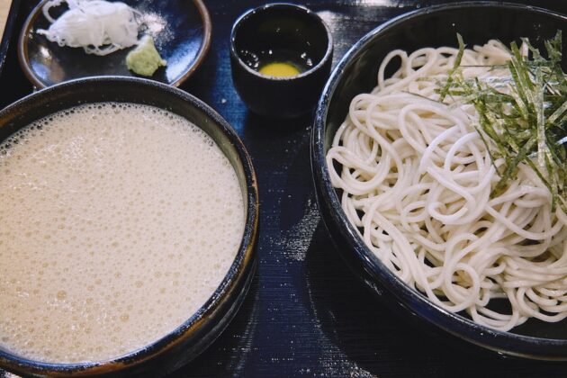 つややかな蕎麦の上には刻み海苔が乗り、横にはとろろがたっぷり。ふわふわの泡が立ったとろろを麺に絡めると、すべすべとのどを通り、山の恵みを口いっぱいに感じました。わさびや薬味を添えて味を引き締めれば、また違った美味しさに。疲れた体にやさしく染み渡ります。